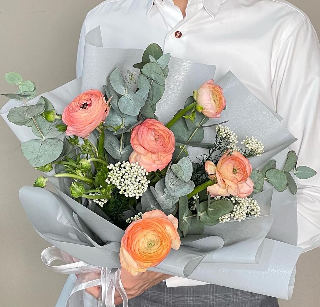 The bouquet consists of ranunculus, foliage and fillers.